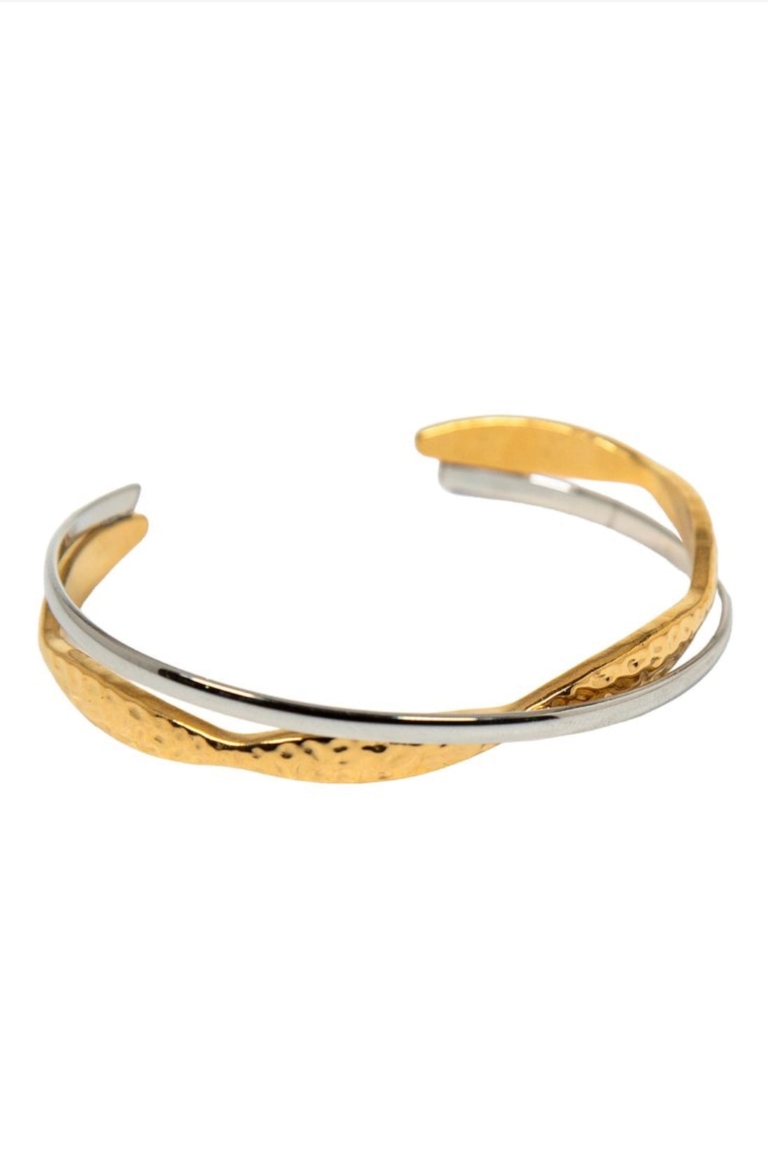 Introducing the Francia Cufflet - Twist Mix! With its wave design and mixed metal tones, this adjustable stainless steel cufflet adds a touch of unique elegance to any outfit. At 6cm in length, it's the perfect accessory for any occasion. Upgrade your style with this twist on a classic design.