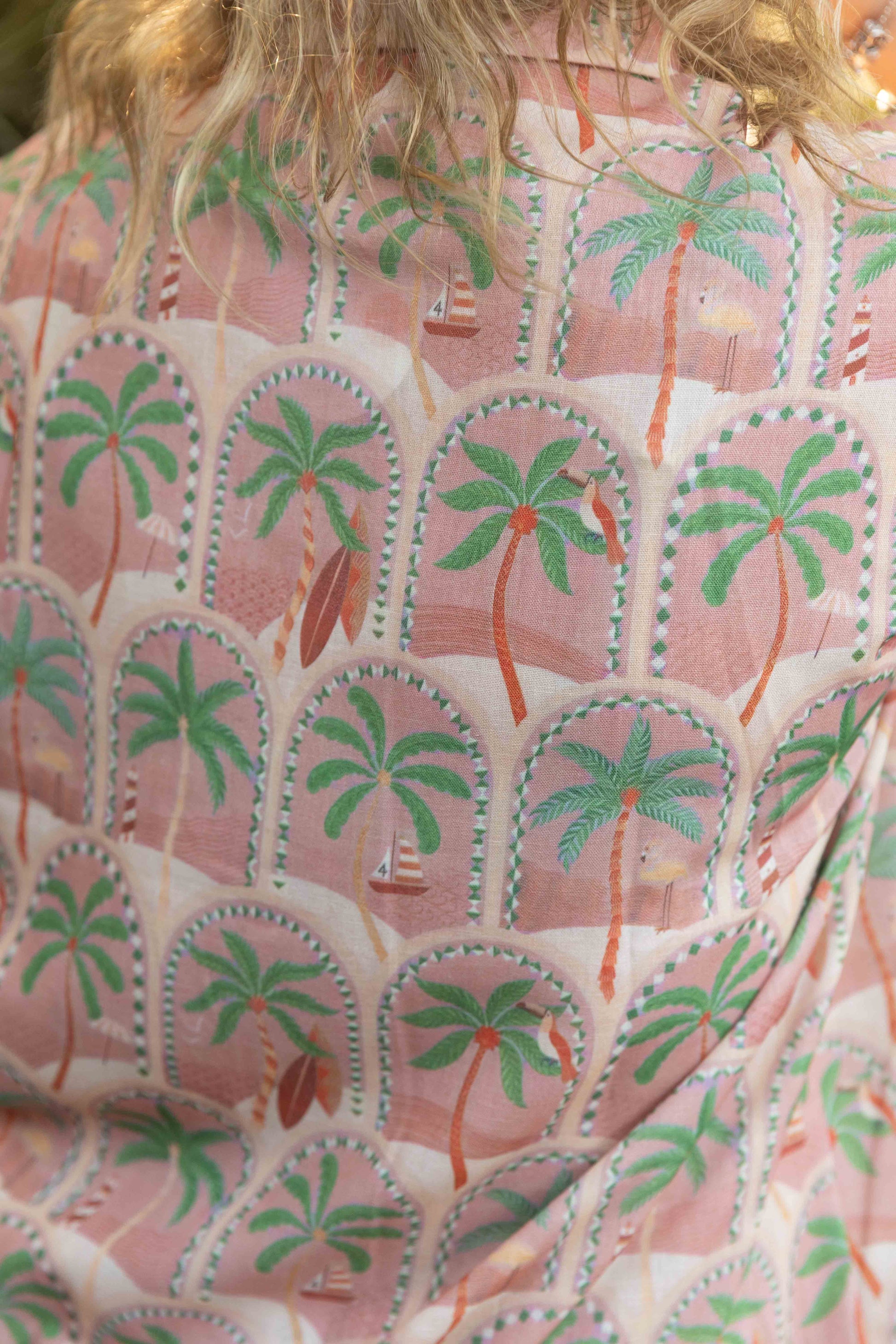 Elevate your style with our Palm Tree Top Set. This playful set features a collared top with a fun palm tree design in pink. The oversized top and 3/4 sleeves add a touch of whimsy to any outfit. Perfect for a day at the beach or a casual brunch with friends.
