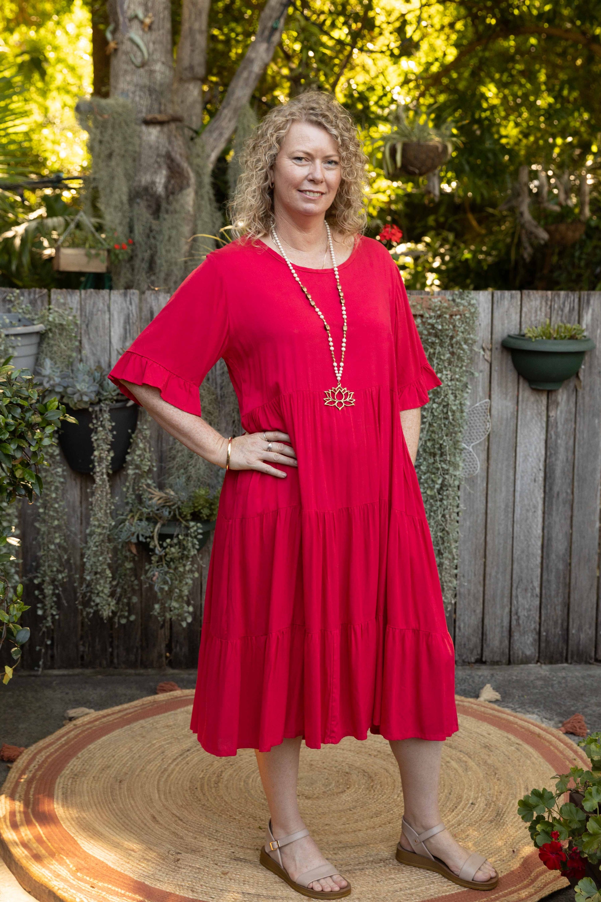 Get ready to turn heads with the Paradise Dress! This stunning dress boasts a beautiful red color and playful details like 3/4 sleeves with ruffles and a tiered flounce skirt. With a relaxed fit, this dress will keep you comfortable and stylish all day long.