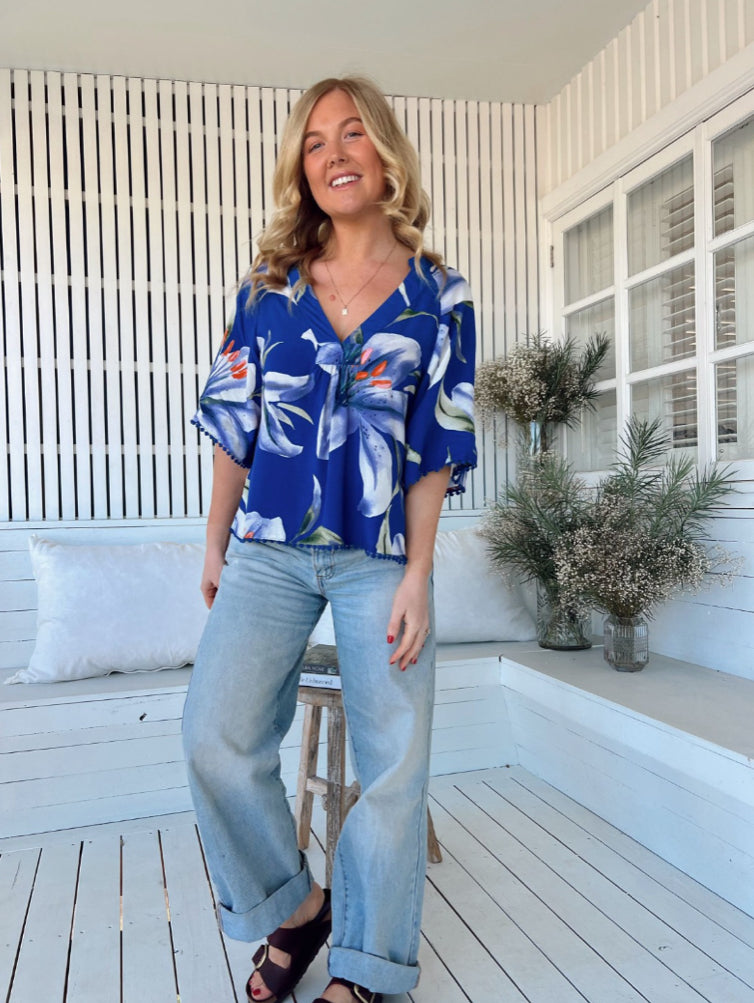 Introducing the Asteria Gabriella Top in our stunning Lily print! This top features a flattering V-neckline and elegant 3/4 sleeves. The laces detail adds a touch of femininity to this versatile piece. Perfect for effortlessly elevating any outfit. (Don't let your wardrobe be without it!)