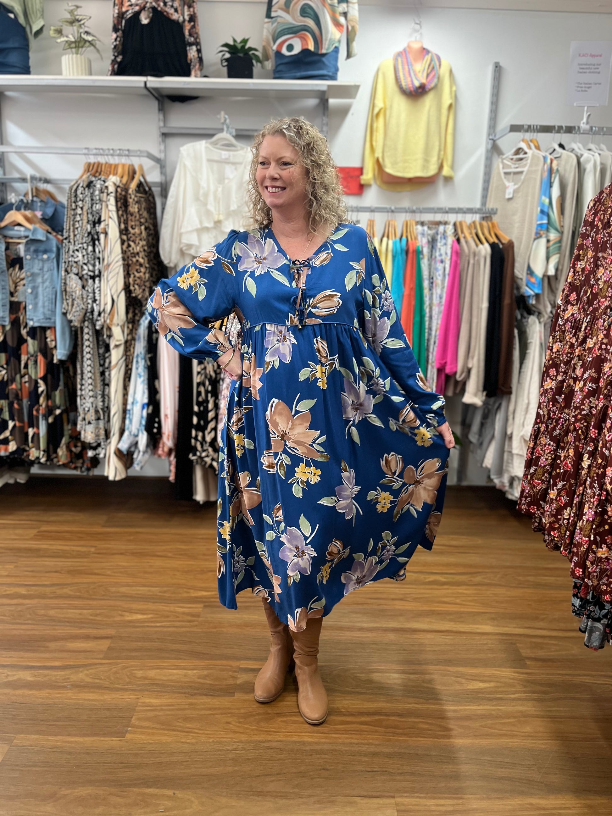 Channel your inner playful fashionista with the Georgia Blue Penny Midi Dress! This stunning dress features a trendy midi length and a gorgeous blue hue. The double tie and loose fit add a touch of uniqueness to this must-have piece. Perfect for any occasion with its long sleeves, this dress will surely make you stand out in style!