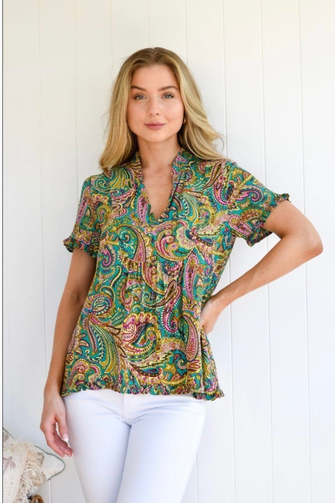 Get ready to relax and unwind in the Ella Top. Featuring a small v-neckline and ruffled sleeves and hem, this loose-fitting top is perfect for lounging below the bust. Find your inner peace and comfort with this playful and quirky piece.